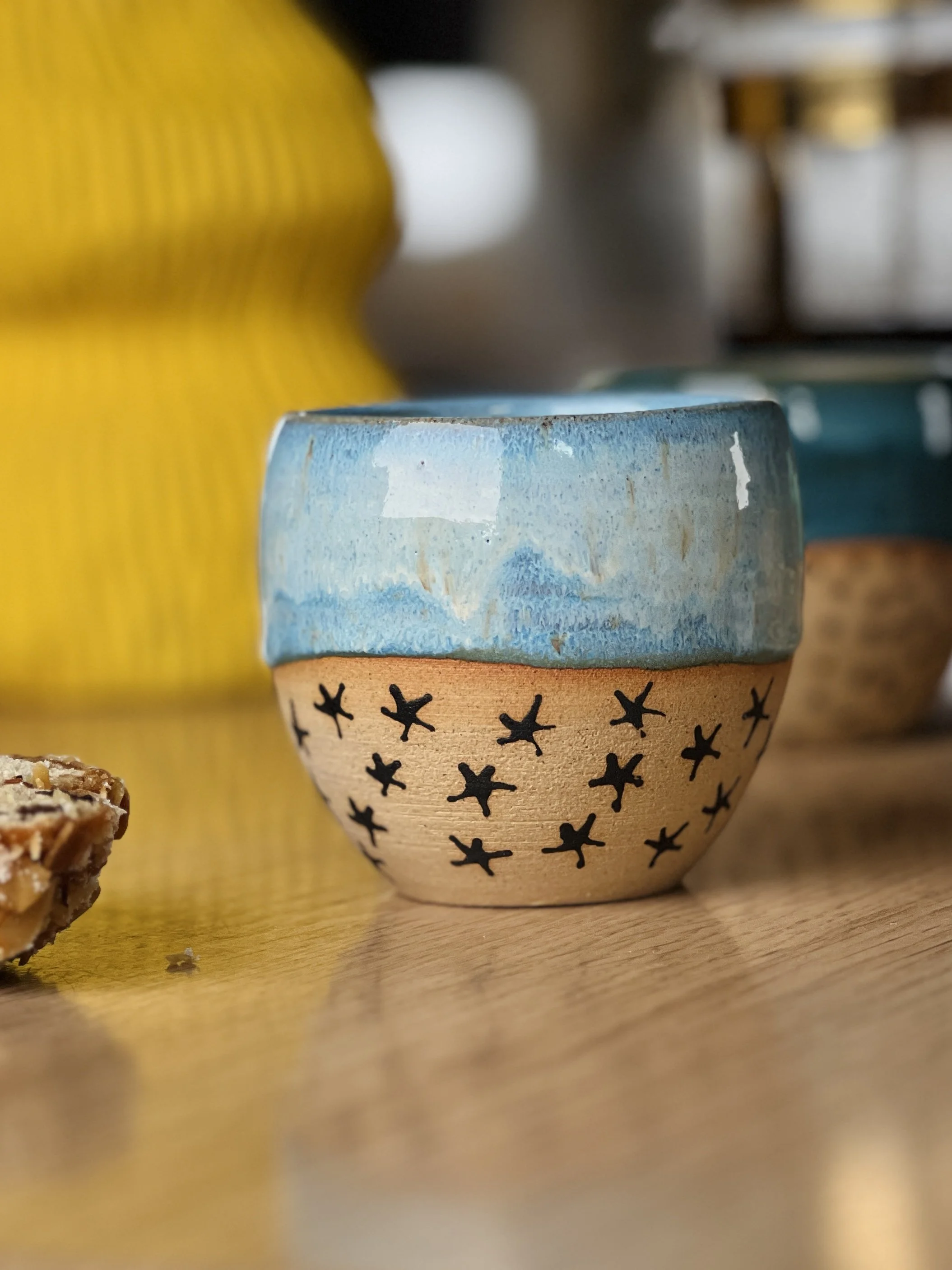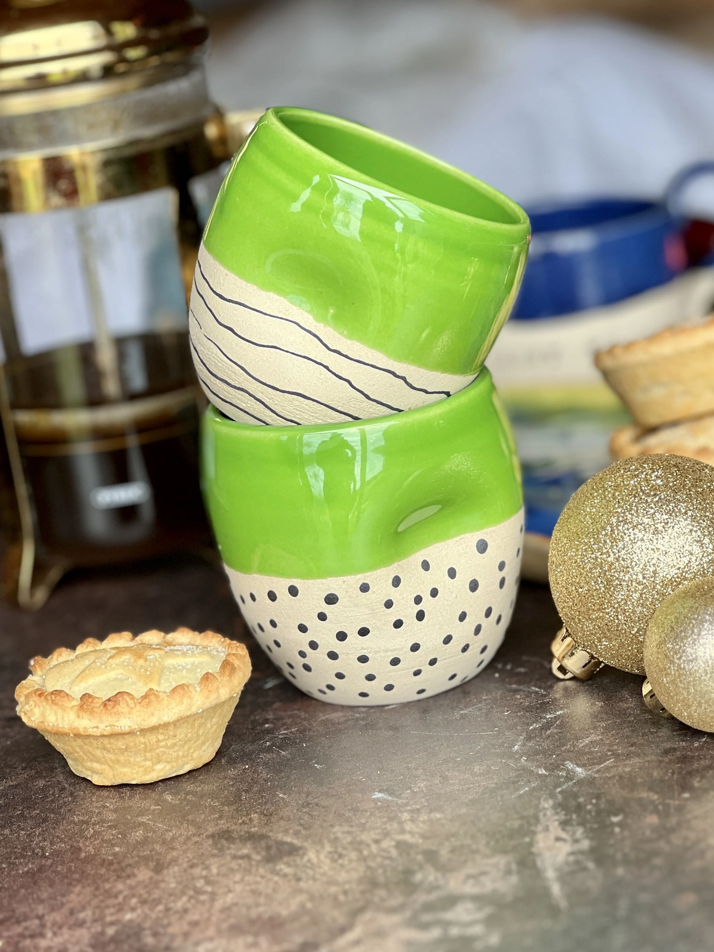 Wheel thrown stoneware mugs decorated in this stunning Orange/Blue combination glaze.